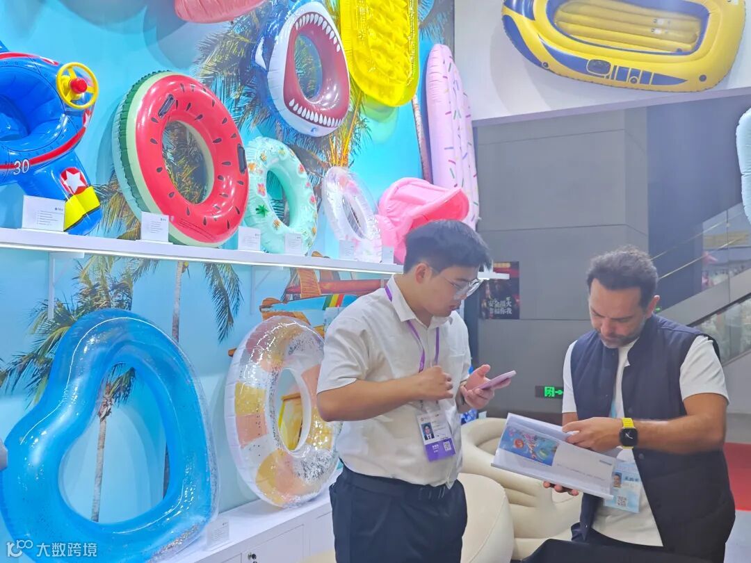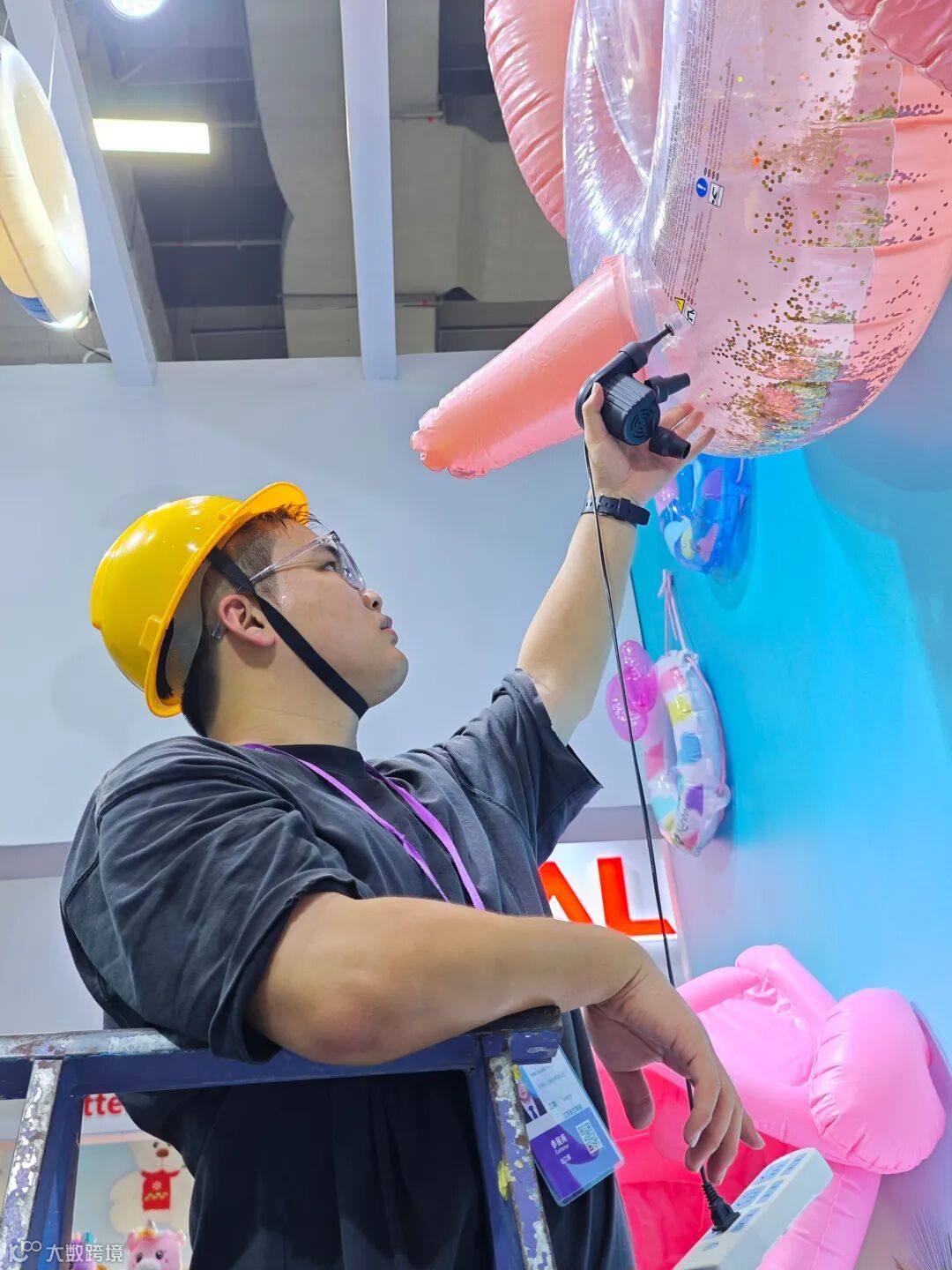 水上用品展区内,充气玩具、水上泳圈、SUP等水上产品错落陈列,青年突击队成员反复调整展陈角度与间距,力求呈现最佳视觉层次与体验效果。产品设计融合渐变美学与安全环保理念,均通过欧洲市场相关标准认证,同时针对欧洲市场本土化场景需求,不断优化细节设计,实用性与场景适配度显著提升,通过“高品质+环保材质+创新设计”的三重优势,直观展现自主品牌核心竞争力。