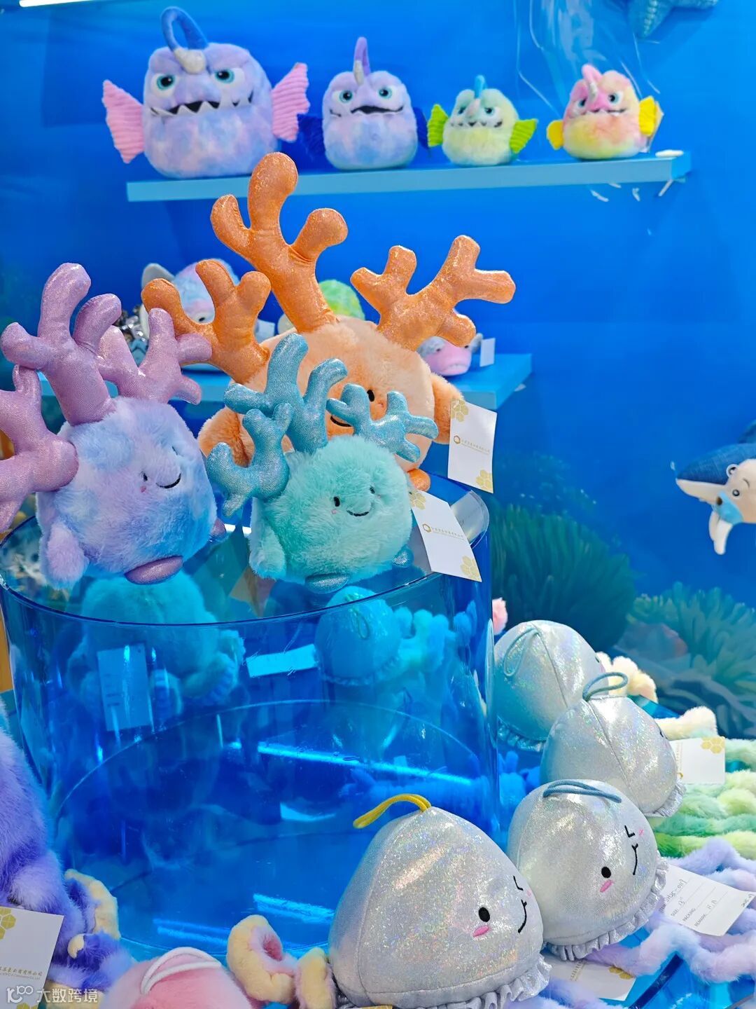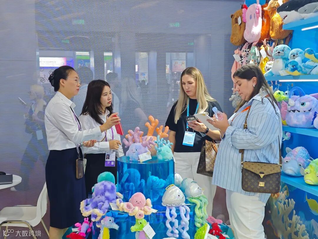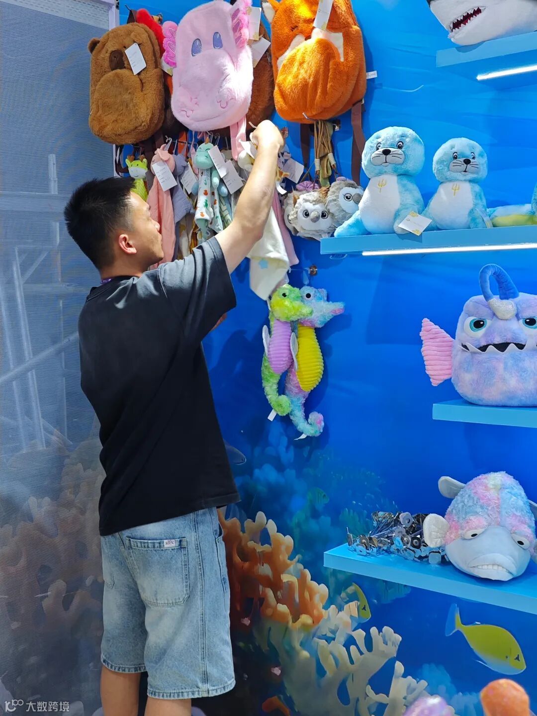 聚焦第三期“美好生活”主题,苏豪云商青年突击队秉持场景化布展思维,以全流程自主研发设计的“海洋系列”IP产品为核心,精心打造毛绒玩具“蔚蓝展区”。圆滚滚的鲸鱼憨态可掬、灵动的章鱼触手微翘,这些兼具萌趣与品质的毛绒玩具均采用柔软亲肤的短绒面料,指尖轻触如云朵般绵软,环保染色工艺和抗起球技术充分保障了长期使用的绿色安全和品牌质感,从触觉到视觉全面诠释“生活+美学”的研发理念,充分展现云商柔性供应链支撑下的快速研发能力和自主品牌实力。展区内,毛绒玩具与蔚蓝色背景相互交融,生动勾勒出深邃灵动的海洋意境,推动展区实现从“静态产品陈列”向“动态生活场景”的转化跃升,为全球客商营造了兼具趣味性和沉浸感的参展氛围与洽谈环境。