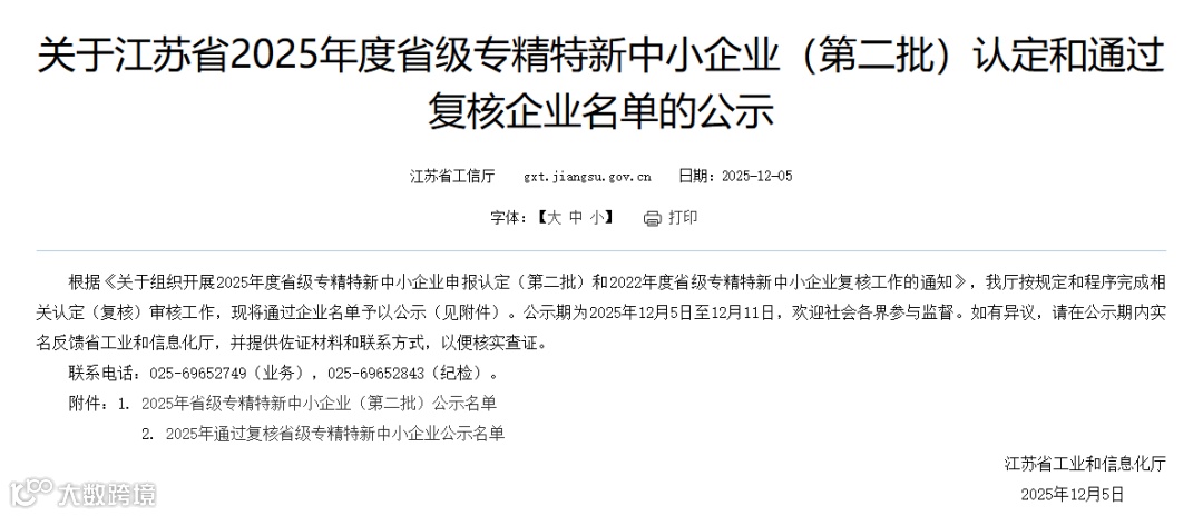 近日,江苏省公布一批2025年度省级专精特新中小企业认定和通过复核企业的名单,苏豪云商成功入选在列。