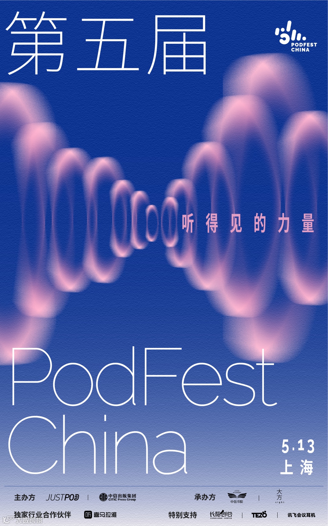 PodFest China是中国首个围绕播客的线下活动品牌,专注于播客创新与观察。自2019年1月开始,PodFest China年会陆续开展了工作坊、行业峰会、行业调研等版块的活动。第五届PodFest China中文播客大会将于5月13日下午在上海·长阳创谷举行。大会以“听得见的力量”为主题,探索声音的创造力,感受听得到的力量。
