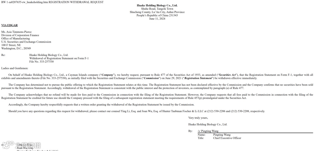 然而,上市之路并非一帆风顺。在经历了一系列的筹备和等待后,直到2023年8月7日,该公司才获得中国证监会的备案接收材料。然而,令人意外的是,在仅仅等待了10个月之后,Huake Holding Biology Co., LTD却在2024年6月11日向美国证监会递交了撤销招股书注册的请求,并紧接着撤回了向中国证监会的备案。至此,这段耗时近四年的上市之旅以一种出人意料的方式告终。