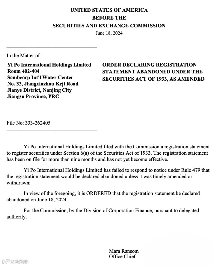更为遗憾的是,从2023年8月10日最后一次更新招股书后,优创易泊未再向SEC提交过新的材料。这一行为直接导致了公司在2024年6月18日收到了SEC的“SEC Staff Action: ORDER”。根据该命令,由于公司的注册声明(F1)已经备案超过九个月但尚未生效,且公司未及时修改或撤回该声明,因此SEC决定宣布该注册声明于2024年6月18日被作废。