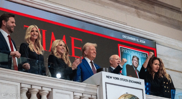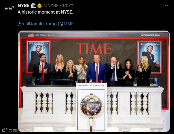 纽交所在官网写道,为纪念特朗普被《时代》杂志评为年度人物,特朗普与洲际交易所(ICE)和《时代》杂志两位首席执行官,以及纽交所总裁Lynn Martin一起敲响了开市钟。