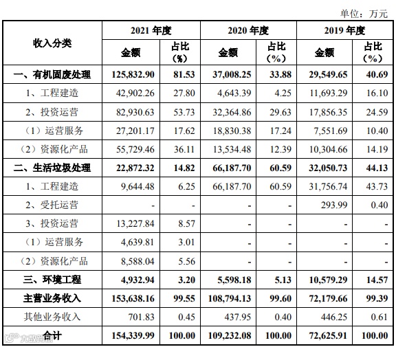 报告期内,公司主营业务收入的主要来源为有机固废处理及生活垃圾处理业务。具体情况如下: