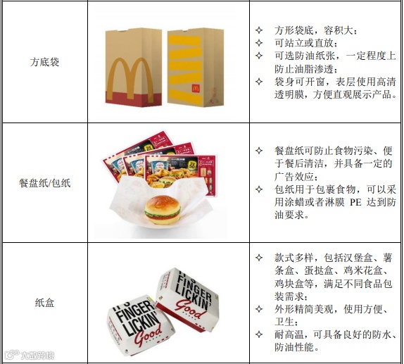 食品包装主要为餐饮行业提供符合食品直接接触标准的纸质内包装,包括QSR 餐厅、咖啡茶饮、烘焙、休闲食品、会议场所等,主要终端客户包括肯德基、麦当劳、星巴克、华莱士、蜜雪冰城、九阳豆业、巴比食品、头号粥铺、永和大王等国内外知名餐饮品牌。