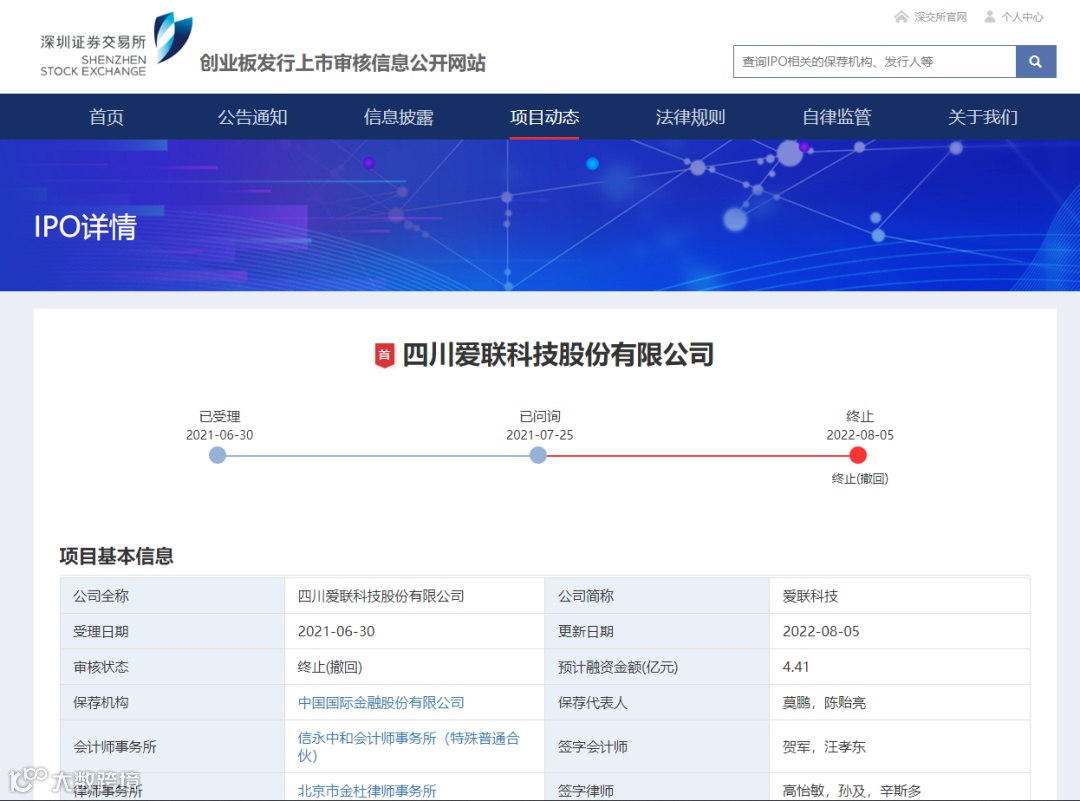 1、2022年8月3日,四川爱联科技股份有限公司申请撤回发行上市申请文件。根据《深圳证券交易所创业板股票发行上市审核规则》第六十七条,本所决定终止对其首次公开发行股票并在创业板上市的审核。 2022-08-05