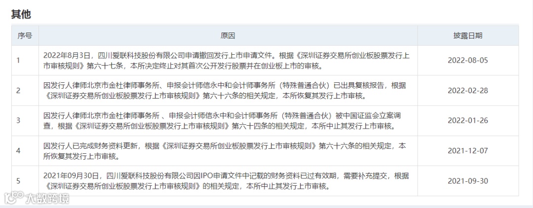 5、2021年09月30日,四川爱联科技股份有限公司因IPO申请文件中记载的财务资料已过有效期,需要补充提交,根据《深圳证券交易所创业板股票发行上市审核规则》的相关规定,本所中止其发行上市审核。 2021-09-30