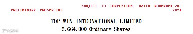 2024年11月25日,来自香港的Top Win International Trading Limited恒荣国际贸易有限公司的控股公司Top Win International Limited(以下简称Top Win)在美国证券交易委员会(SEC)公开披露招股书,拟于美国纳斯达克上市,其股票代码为TOPW。 其于2024年8月16日在SEC秘密递表。