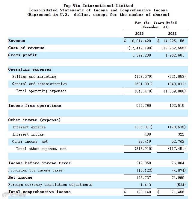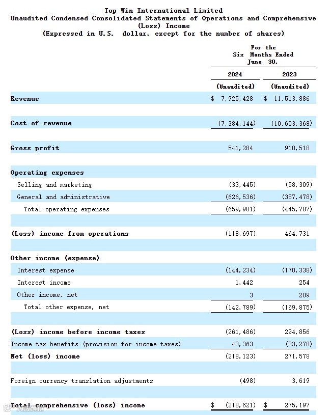 招股书显示,在过去的2022年、2023年和2024年前六个月,Top Win的收入分别为1,422.52万、1,881.44万和 792.54万美元,相应的净利润分别为7.15万、19.81万和 -21.86万美元。