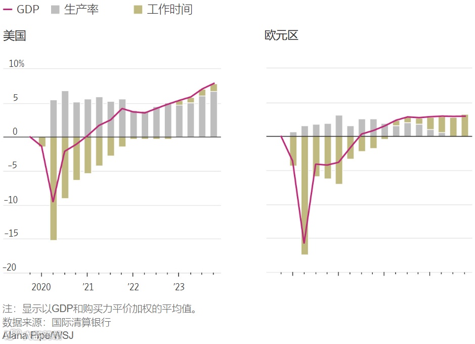 由央行等机构组成的国际清算银行(Bank for International Settlements)计算得出,从2019年底到2023年底,美国总产出增长了7.9%,其中1.2%来自工作时间的增加,6.7%来自生产率的提高,即每小时产出的增加。欧元区同期产出增长了3%,这完全是由于工时的增加。