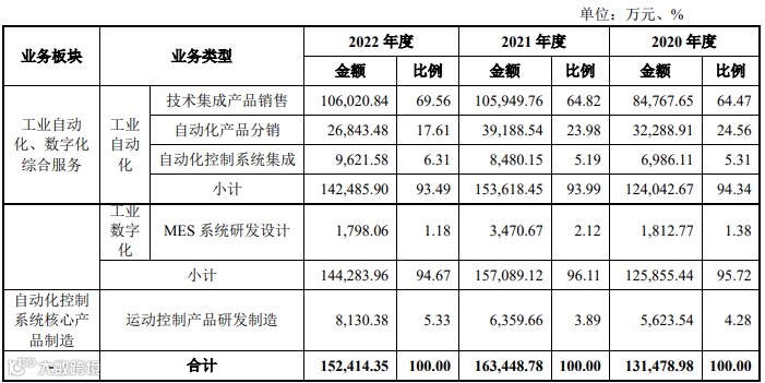 发行人的工业自动化综合服务的主要业务包括技术集成产品销售、自动化控制系统集成和自动化产品分销;工业数字化综合服务主要为MES系统设计开发;自动化控制系统核心产品研发制造板块主要为运动控制核心产品——伺服系统和PLC的研发制造。