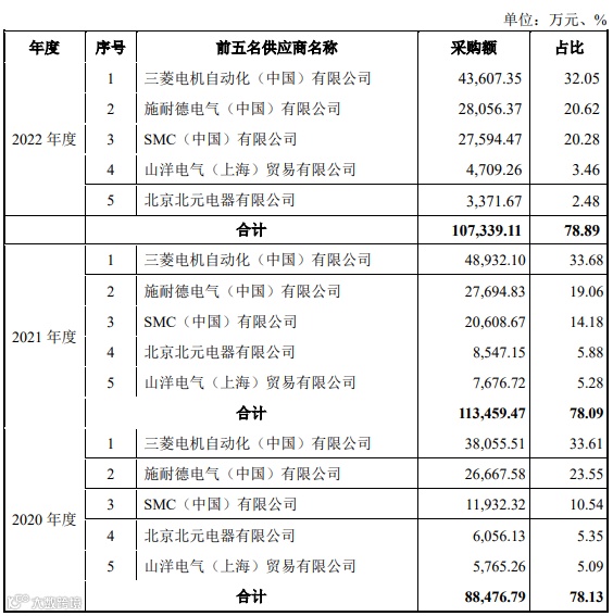 发行人凭借自身较强的工业自动化、数字化综合服务能力,成为三菱、施耐德、SMC、北元电器、山洋、西门子、ABB等国内外知名自动化产品制造商在国内的重要代理商之一。报告期内,发行人从前五大供应商采购的产品金额分别为88,476.79万元、113,459.47万元和107,339.11万元,占当期采购总额的比例为78.13%、78.09%和78.89%,对主要供应商的采购占比较高。