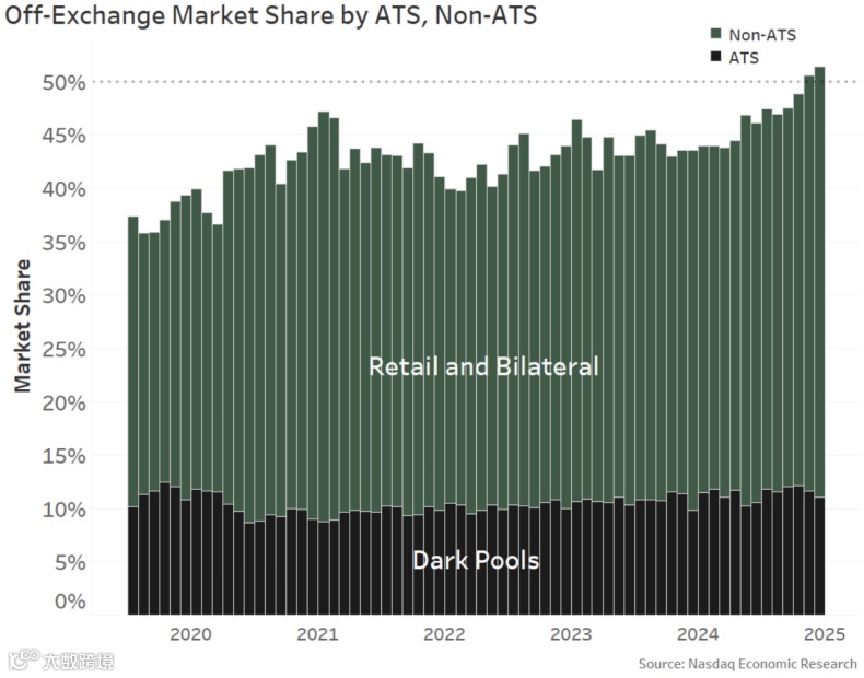 事实上,2024年11月,美国股市首次出现场外交易量超过场内交易量的情况。2024年12月和2025年1月,场外交易量占比也持续保持在50%以上。