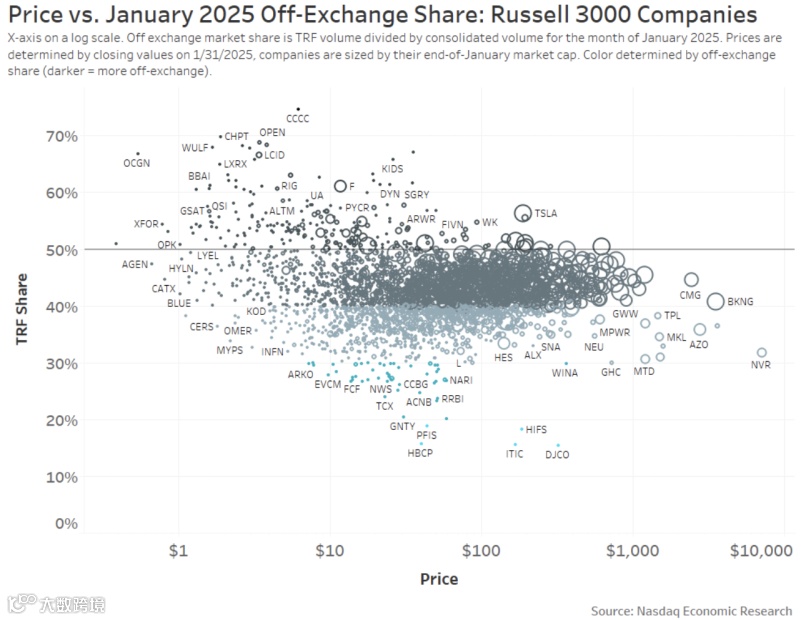 无论股票价格(横轴)或市值(圆圈大小)如何,大多数股票的场外交易份额都在40%-50%之间。