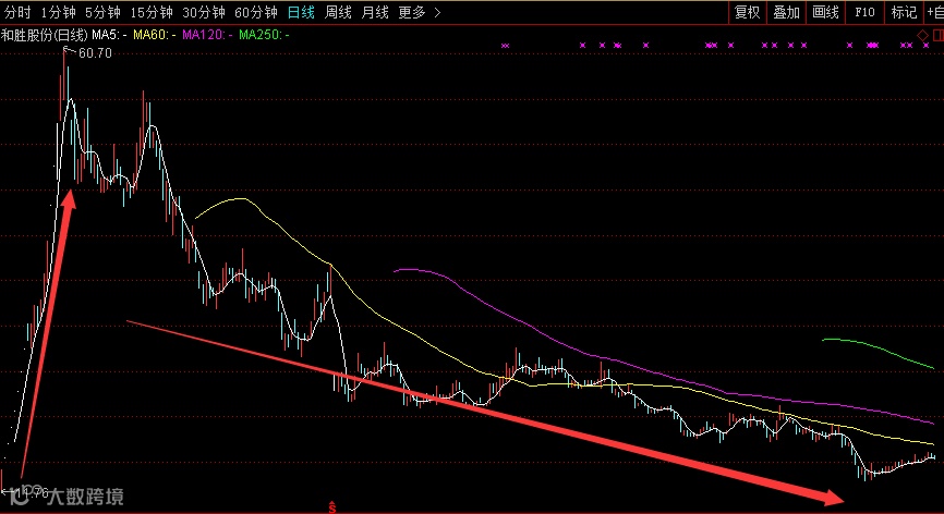 和胜股份的走势也大体类似:先是上市初期连续爆炒,最多较发行价翻了6倍多,而后就是绵绵阴跌,不断向发行价靠拢。