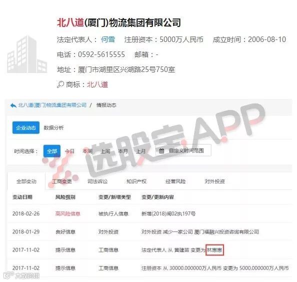 然而,根据企查查的信息显示,厦门铁八道物流集团有限公司的法定代表人为何雪,然而此前工商变更信息显示,前一位法人名为“林慧慧”,她和“林庆丰”是什么关系,却不得而知。