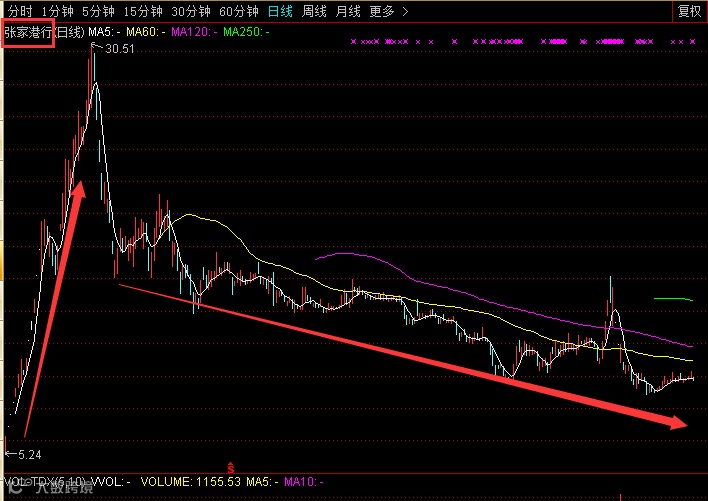 张家港行2017年1月24日上市,公司发行价为4.37元,上市后虽只录得4个连续一字涨停板,但在开板后仍持续上涨,至当年4月5日,股价一度涨至30.51元,较发行价暴涨598.17%,市盈率一度飙升至数十倍以上,远高于一般银行股。股价短时间爆涨的后果便是漫漫调整,截至目前,张家港行股价已较最高峰下跌近七成,套牢无数投资者。