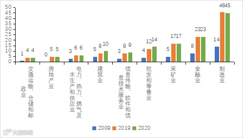 对比2009年我国上榜企业行业分布发现,11年间,9大行业上榜企业数量均实现成倍增长,其中制造业、金融业、零售和批发业的企业数量增幅均在3倍以上。