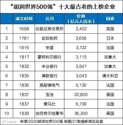 上榜企业平均年龄64岁,即成立于1956年,125家公司历史超过100年,其中只有6家超过200年。其中最古老的是322岁的伦敦证券交易所和239岁的武田制药。