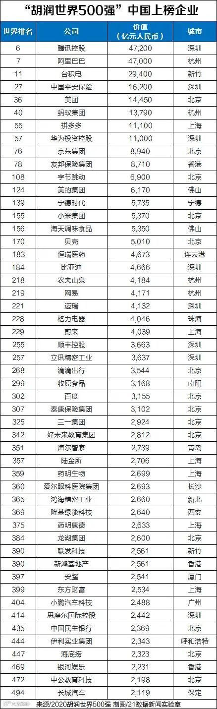中国有51家公司进入“胡润世界500强”,以腾讯和阿里巴巴为首,这两家公司均进入世界前十名,分别位列第六名、第七名。