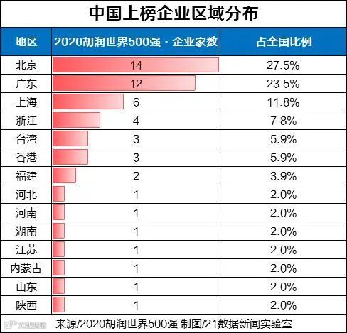 从区域分布来看,入榜的51家中国企业分布在全国14个地区,其中北京最多(14家),广东紧随其后(12家),上海排名第三(6家)。