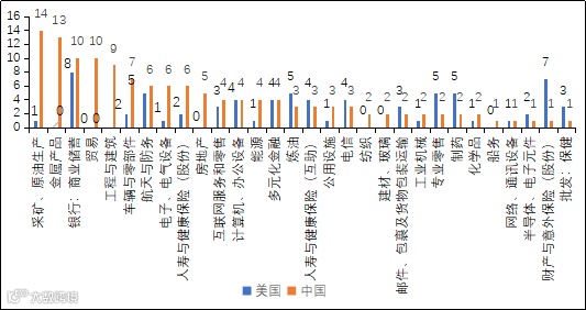可以看出,我国上榜企业集中在金融、石化冶金等传统领域,新兴领域企业较少。特别是在计算机软件、信息技术服务、医疗等技术密集型高端新兴领域,均有美国企业上榜,我国则空白。