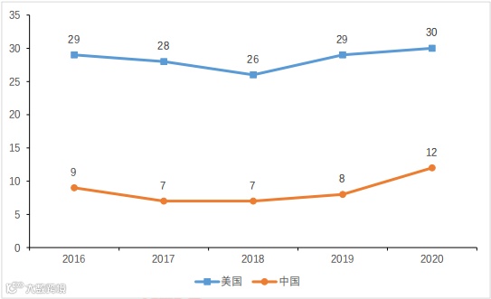 总体来看,中美信息技术服务业入围企业数量均较少,美国信息技术服务业入围企业数量年均多于我国相应企业数量约20家,2020年中美相关企业数量差距缩小至8家。