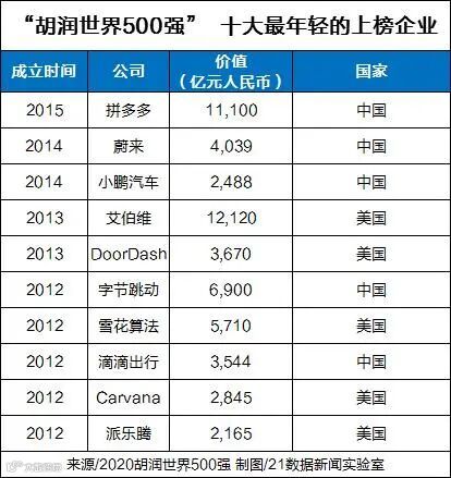 22家公司成立不到10年,其中最年轻的是三家中国公司:拼多多仅用了五年达到1.1万亿元的价值,其次是六岁多的电动汽车蔚来和小鹏。