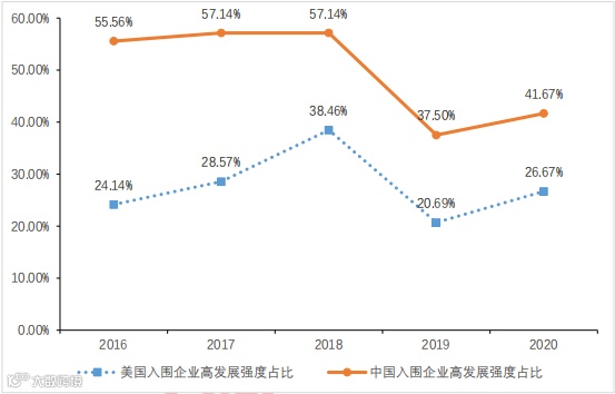 我国上榜制造业企业发展强度波动上升,但仍低于美国行业发展强度。自2016年以来,我国上榜制造业中、高发展强度企业占比均呈波动上升趋势,其中高发展强度企业占比基本在9.44%左右,中发展强度企业占比基本在30.41%左右。自2016年以来,美国上榜制造业中、高发展强度企业占比均呈波动下降趋势,其中高发展强度企业占比基本在18.10%左右,中发展强度企业占比基本在46.88%左右。总体来看,美国制造业入围企业高发展强度占比约是相应我国企业的1.9倍,中发展强度占比约是相应我国企业的2.6倍。