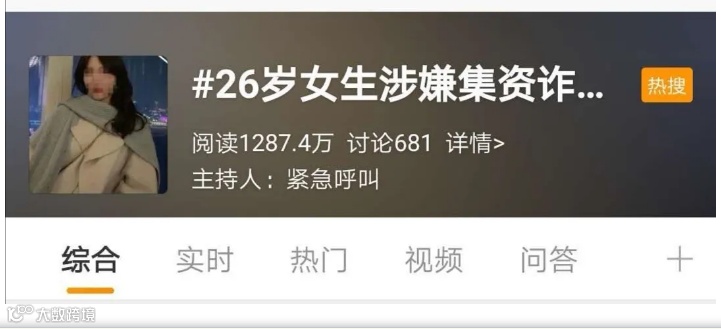 如果大家有印象的话,这个“白富美”在9月底的时候上过热搜。彼时,一则“26岁女生涉嫌集资诈骗1900万被公诉”的话题冲上微博热搜。