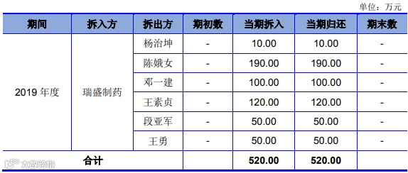 2019 年度,子公司瑞盛制药向杨治坤等少数股东及其亲属拆入资金 520 万元,其中与杨治坤的 10 万元借款已在招股说明书与关联方的资金拆借中披露。上述资金拆入系受过往年度利润分红的影响,瑞盛制药出现临时性资金短缺,同时各股东就增资事宜未达成共识,以致发生该等资金拆入交易。资金拆入期间,主要用于日常生产经营。截至 2019 年 12 月末,瑞盛制药已全部归还完毕上述借款,鉴于资金使用费金额较小,未对发行人财务状况产生重大影响。