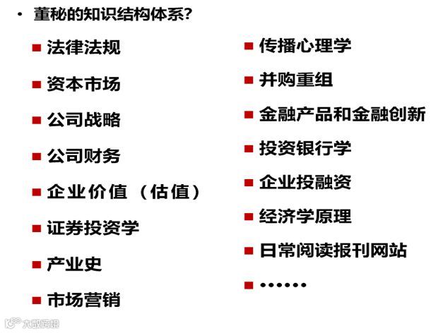 例如公司治理、三会运作、内部控制以及信息披露。懂得市值管理、股权激励,企业成长,如何利用资本市场持续融资。