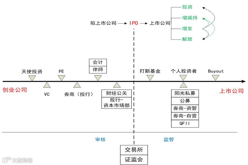 一个企业从小长到大,它就必然要经历一些过程。从最早的创业公司到天使投资,到VC、PE,然后到接触券商,去上科创板/新三板或者去冲IPO。如果能成功上市,就有新股申购基金,然后有散户、有机构投资者介入。机构投资者包括阳光私募、公募、券商-资管、券商-自营等。在一个企业成长的整个链条里面,你会发现一个典型的特点,随着这个链条的延伸,企业跟资本市场交融的程度越变越深。