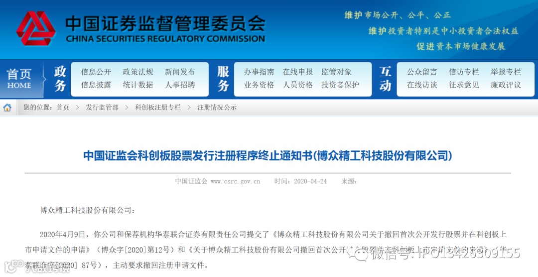 中国证监会科创板股票发行注册程序终止通知书(博众精工科技股份有限公司)