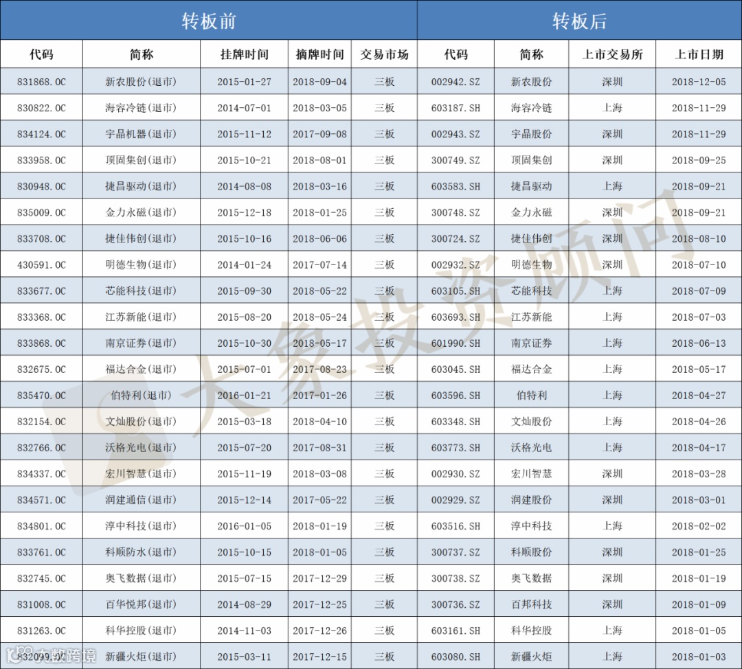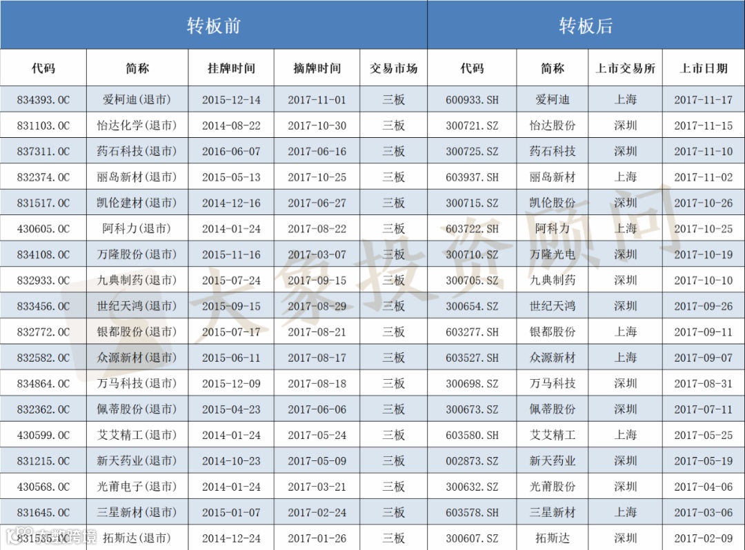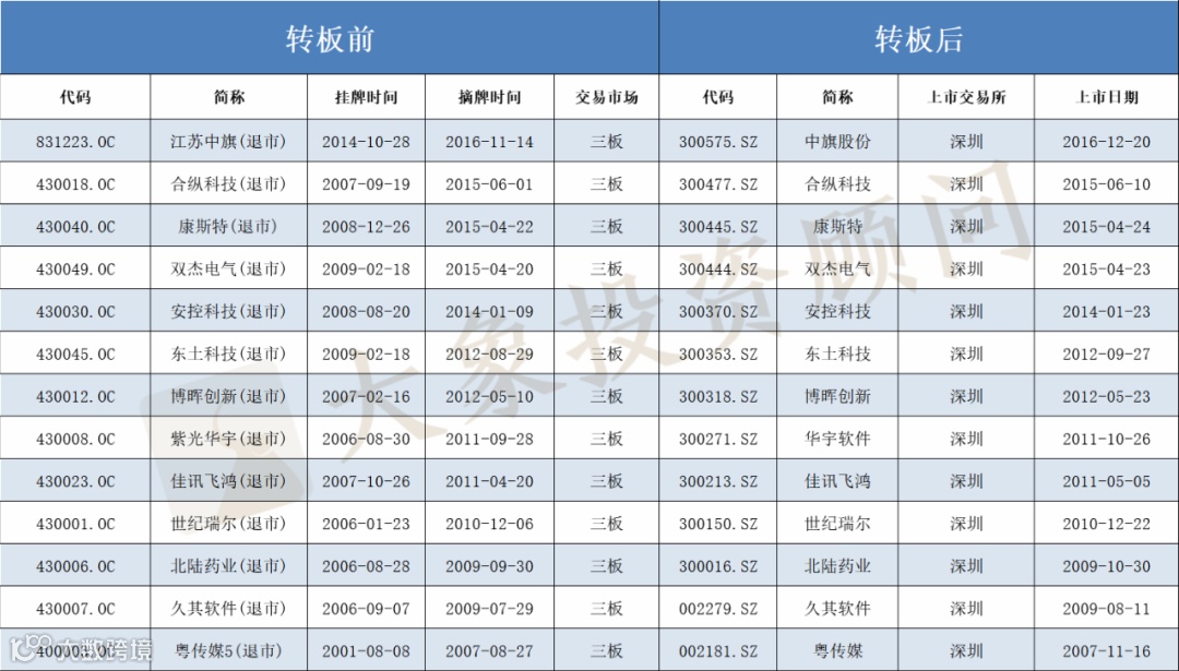 新三板企业“转板”A股成功最早的一例发生在2007年11月16日,粤传媒5于2007年8月27日摘牌后不到3个月便成功上市。