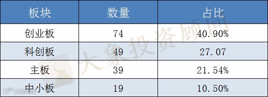 按板块分类,181家企业中,74家在创业板上市,占比40.90%;49家在科创板上市,占比27.07%;39家在主板上市,占比21.54%;19家在中小板上市,占比10.50%。