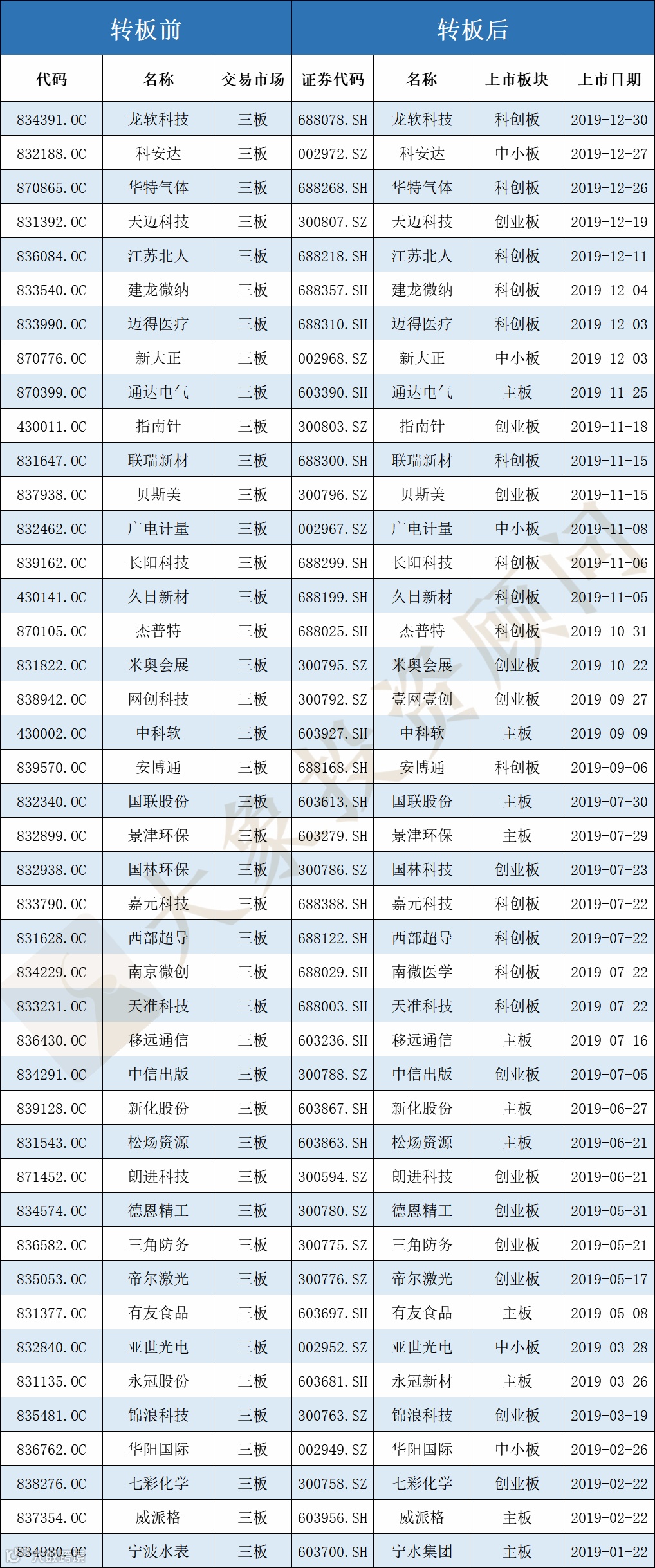 以下为2007—2019年度新三板转A股成功的企业名单: