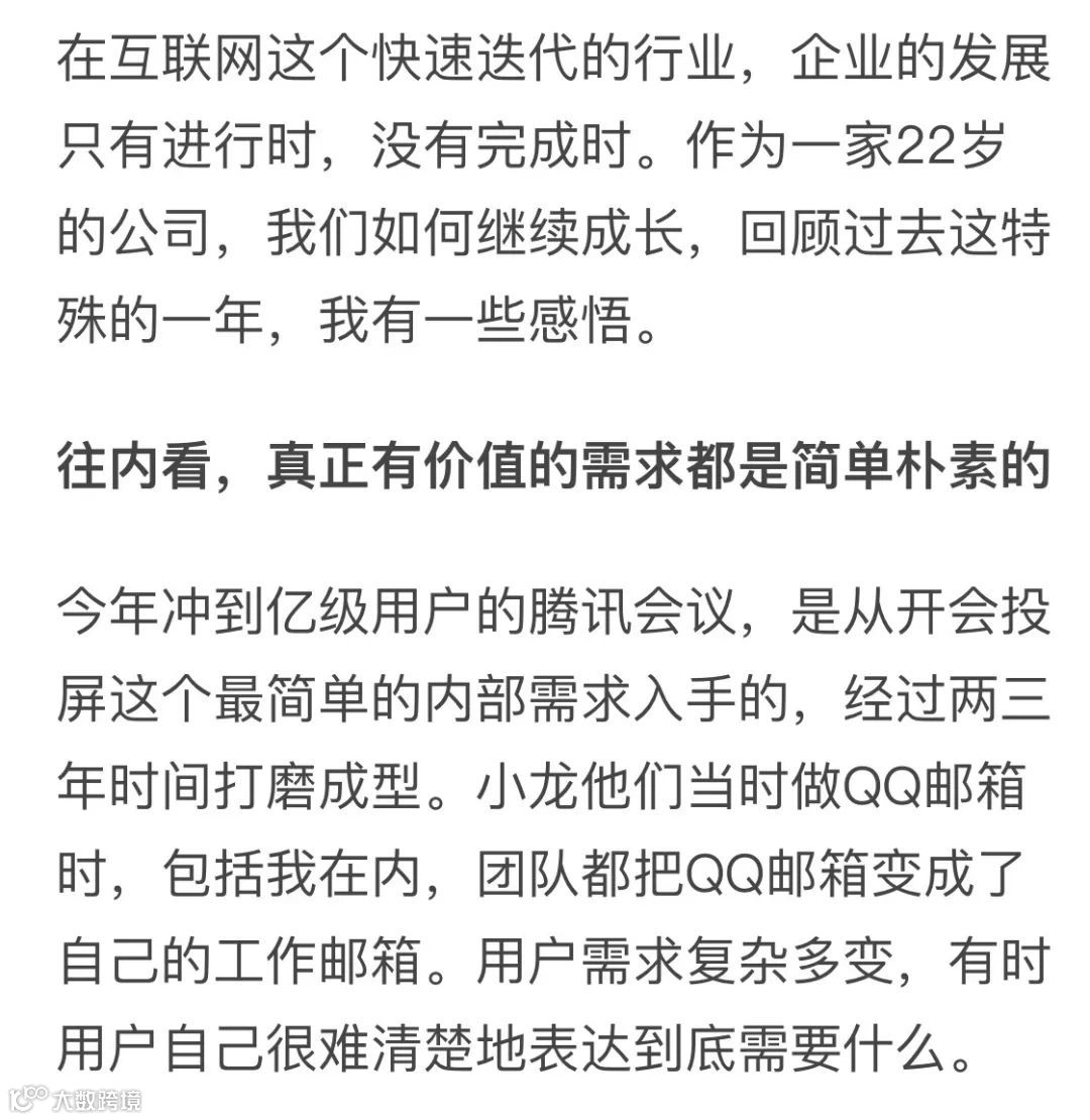 但我们一直有一种敢拼敢闯不服输的精神,一路从即时通信拓展到内容服务更多领域,从PC时代走到移动互联网时代,这两年又深耕产业互联网,不断打开了新的空间和战场。在企业的成长中有一些关键机会,跨过去能飞得更远,跨不过去会掉队,甚至倒下。