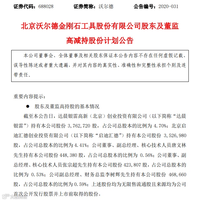 沃尔德(688028.SH)公布,公司于2020年7月23日收到股东达晨银雷,启迪汇德,公司董事、副总经理、核心技术人员唐文林、张宗超,副总经理、财务总监李树辉发来的《关于股份减持计划的告知函》,上述股东拟通过集中竞价、大宗交易方式合计减持公司股份不超726.2126万股。