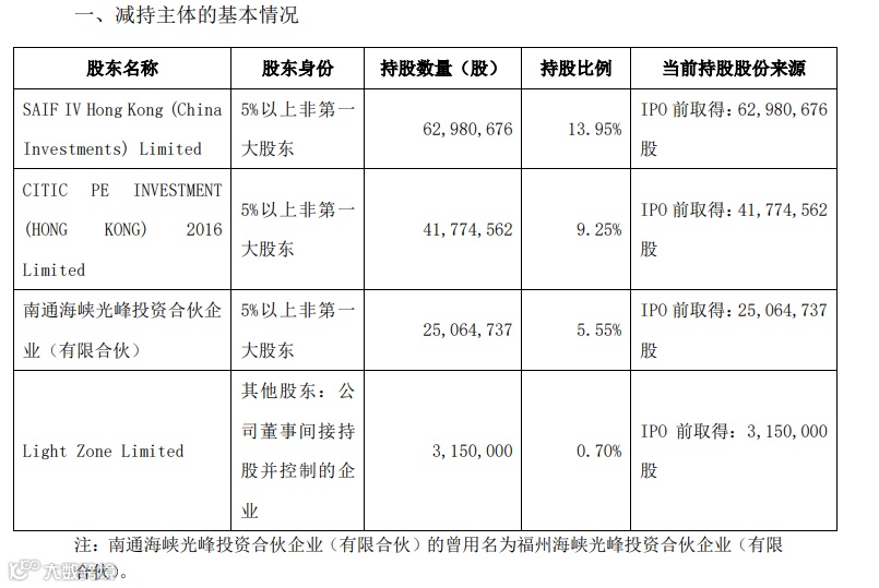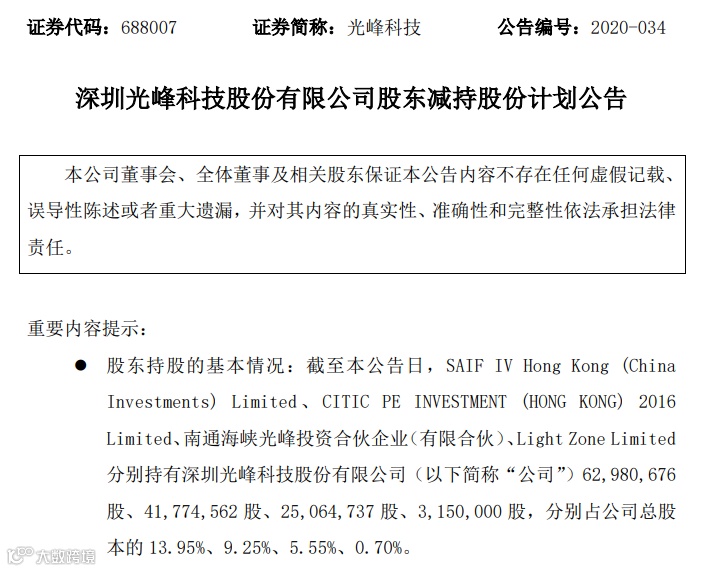 23日下午,最先出来消息的是光峰科技。公告显示SAIF IV Hong Kong (China Investments) Limited、CITIC PE INVESTMENT (HONG KONG) 2016 Limited、南通海峡光峰投资合伙企业(有限合伙)、Light Zone Limited拟分别减持不超824.3588万股、2709.3264万股、451.5544万股、78.75万股,合计减持不超过4063.9896万股,不超过公司股份总数的9%。