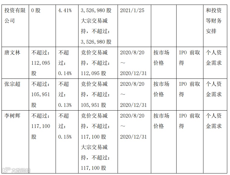 另外,因个人资金需要,高管唐文林、张宗超、李树辉先生计划自本公告披露之日起15个交易日后的 2020 年 8 月 20 日至 2020 年 12 月 31 日内进行减持。