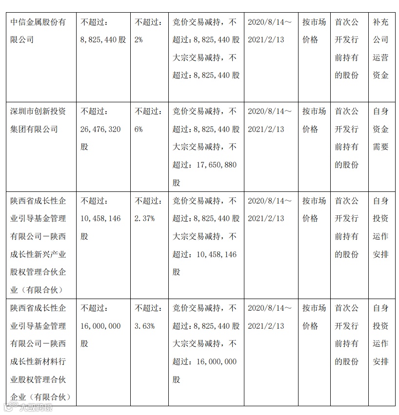 西部超导(688122.SH)公布,公司于2020年7月23日收到股东中信金属、深创投、陕西成长新兴及陕西成长新材料出具的《减持计划告知函》。