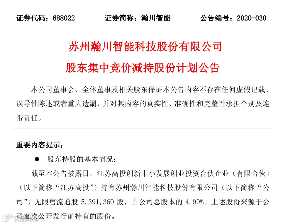 瀚川智能(688022.SH)公布,截至本公告披露日,江苏高投创新中小发展创业投资合伙企业(有限合伙)持有公司无限售流通股539.136万股,占公司总股本的4.99%。上述股份来源于公司首次公开发行前持有的股份。
