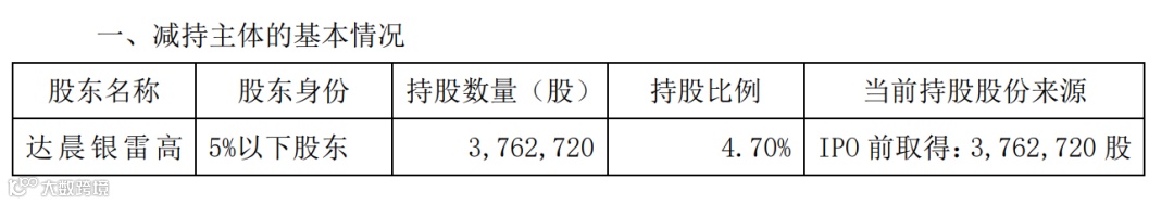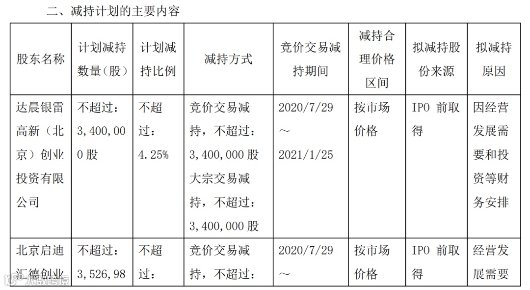 公告显示,达晨银雷因经营发展需要和投资等财务安排,拟通过证券交易所集中竞价交易、大宗交易等符合法律法规规定方式减持股份数量将不超过 3,400,000 股,即不超过公司总股本的 4.25%。