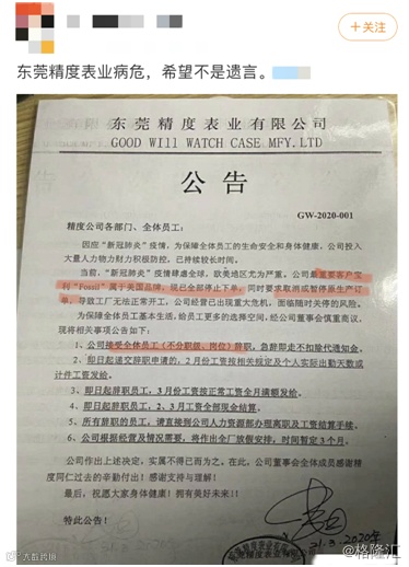 3月21日,东莞精度表业有限公司在厂内发布公告称,“当前,新冠肺炎疫情肆虐全球,欧美地区尤为严重。公司最重要客户宝利‘Fossil’属于美国品牌,现已全部停止下单,同时要求取消或暂停原生产订单,导致工厂无法正常开工,公司已出现重大危机,面临随时关停的风险。”