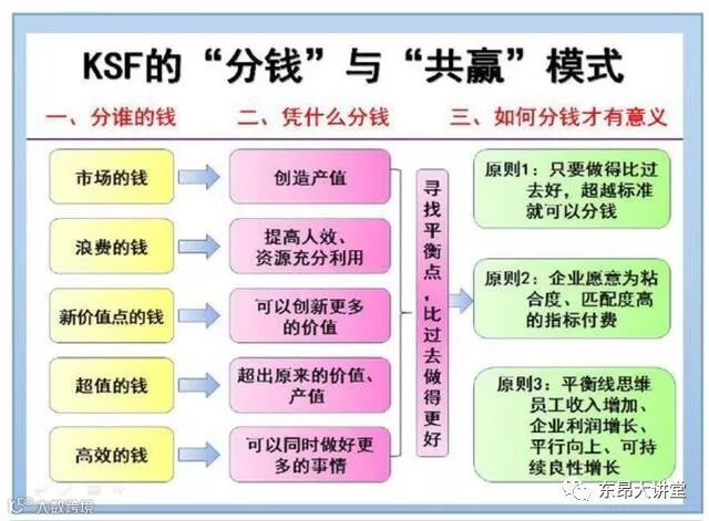 KSF模式是管理者和企业共赢的模式,给管理者开拓6-8个绩效激励渠道,然后再每种渠道上找到平衡点,然后进行分配,这个模式分配的不是企业的利润,而是一种超价值的分配模式,要求管理者拿出好的结果、效果与企业进行价值交易,企业赢得的是高绩效、管理者员工则赢得高收入。