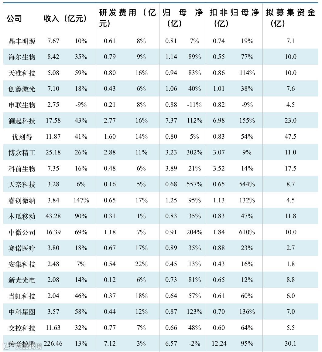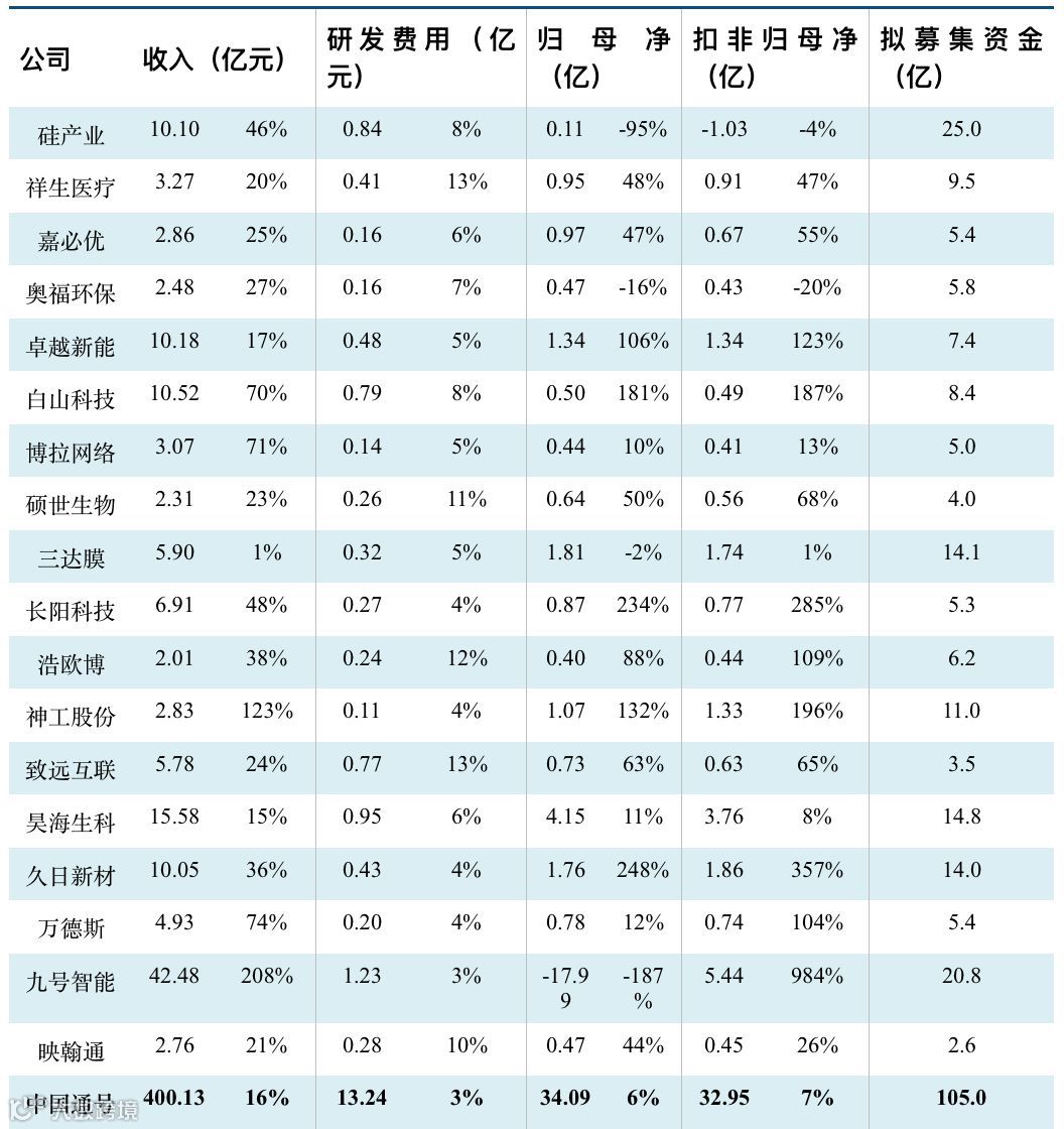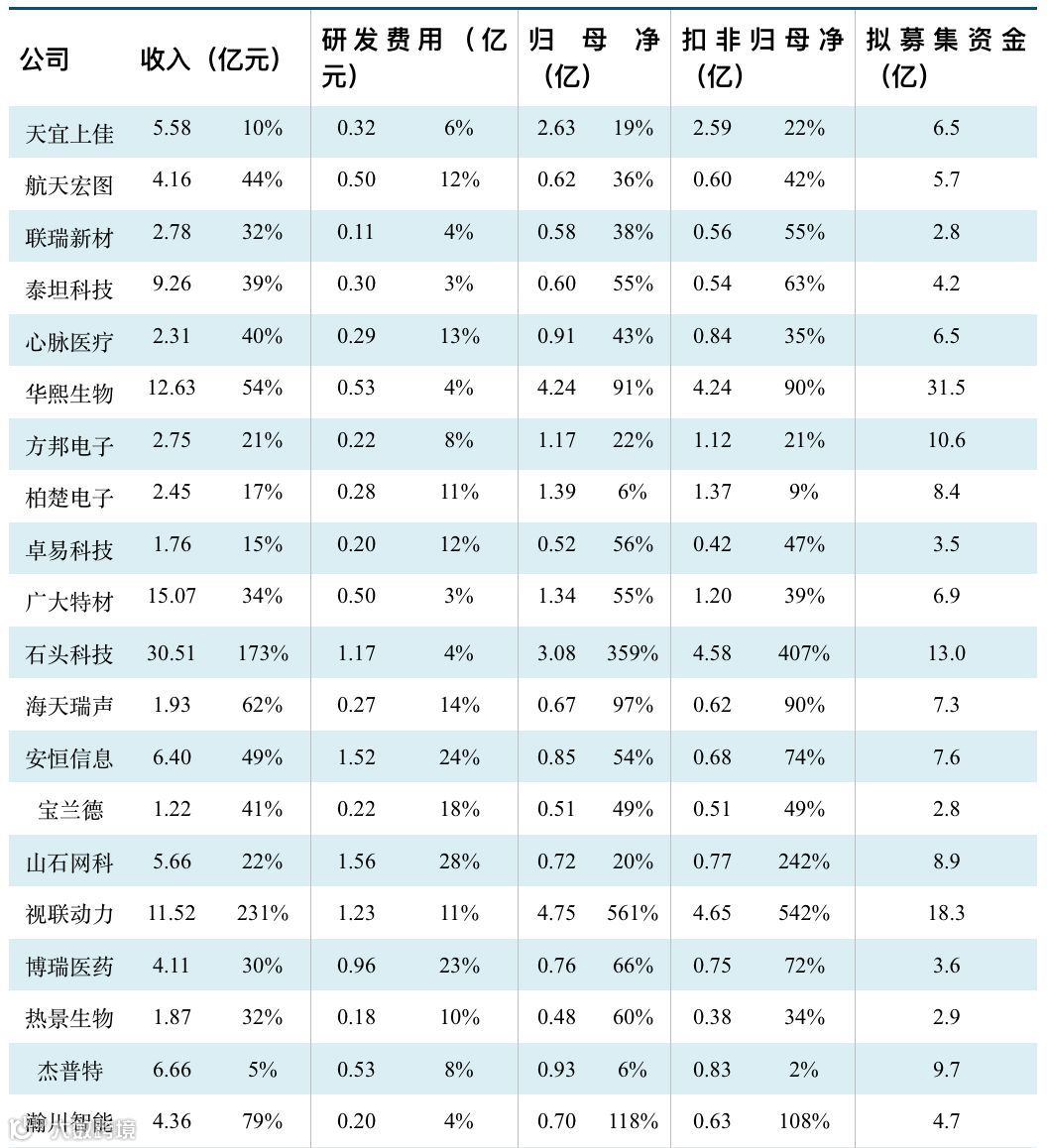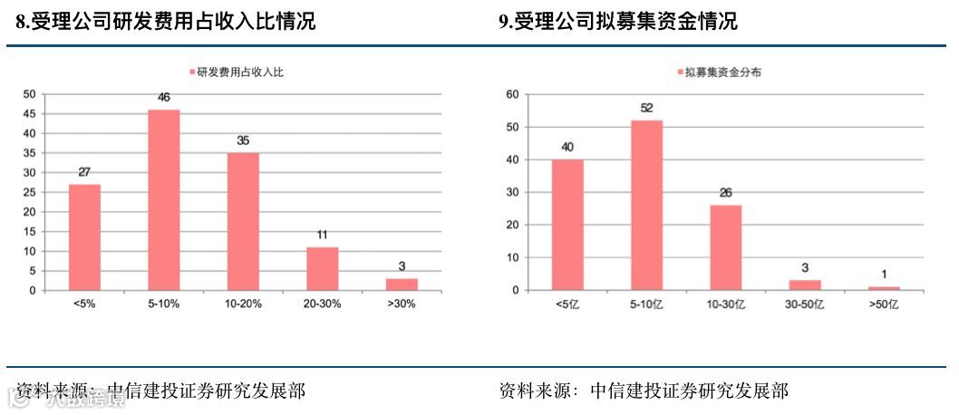 募集资金方面:122家公司合计拟募集资金1157.6亿元,平均募集9.5亿。其中92公司拟募集资金小于10亿,26家公司在10-30亿之间(包含天合光能30亿),3家拟募集资金在30-50亿,分别为优刻得47.5亿、传音控股30.1亿和华熙生物31.5亿。1家拟募集资金超过了50亿,为中国通号105亿。