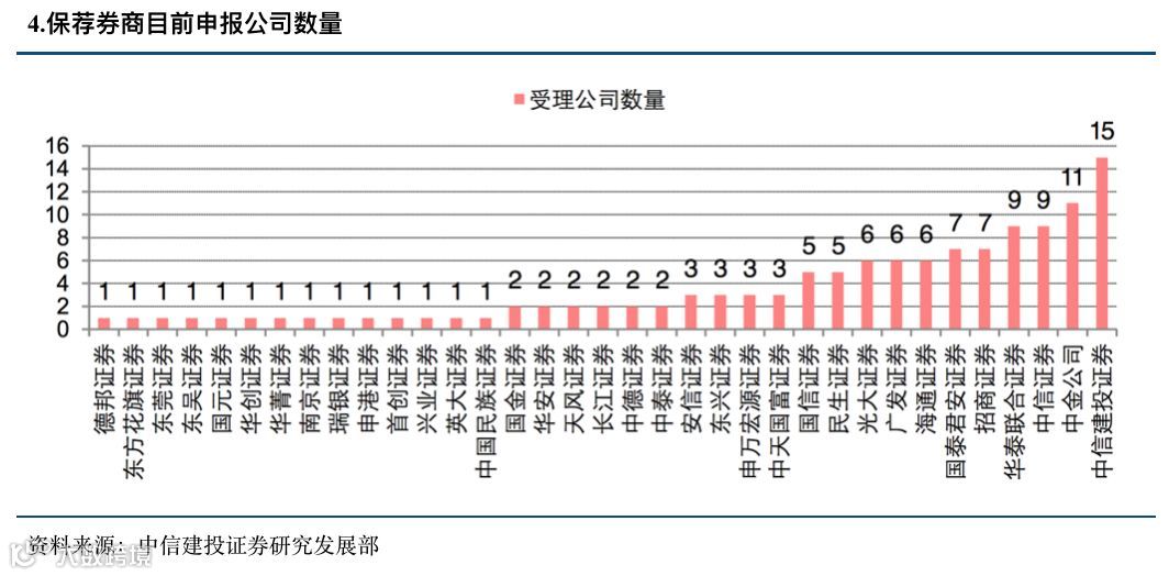 中信建投证券目前申报公司15家,位列第一,其次是中金公司11家,中信证券和华泰联合各9家。