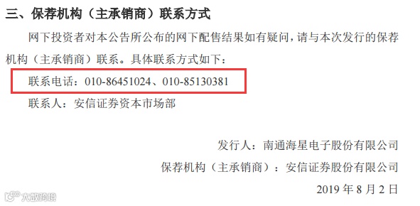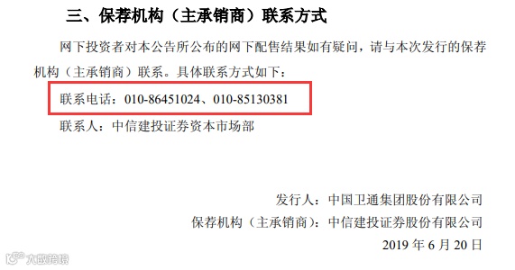 凑巧的是,中国卫通(601698.SH)于2019年6月28日正式登陆A股。比照该公司的中签公告可以发现,两家公司公告的行文结构很相似。最重要的是,中国卫通的保荐机构中信建投资本市场部的联系电话就是“010-86451024、010-85130381”,与前述海星股份公告更改之前的联系方式一样。
