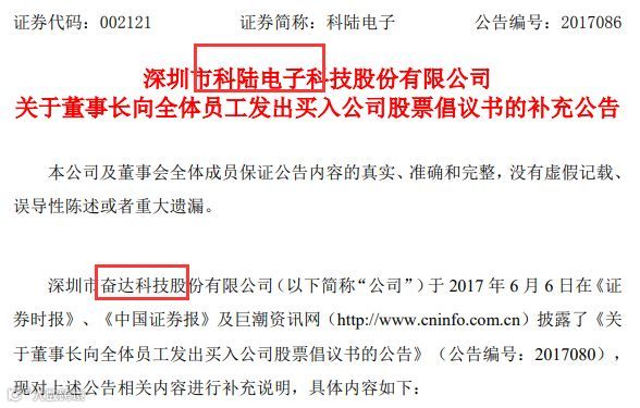 2017年6月,科陆电子发布了“关于董事长向全体员工发出买入公司股票倡议书的补充公告”,而在公告的第一句,就写成了“深圳市奋达科技股份有限公司(以下简称“公司”)于 2017年6月6日”。